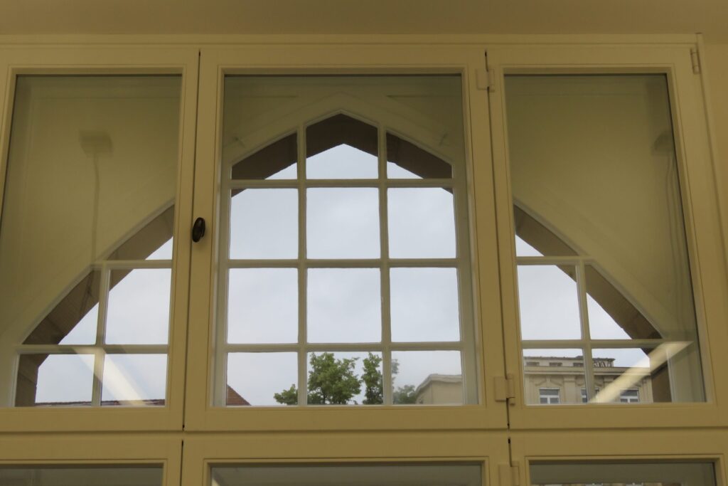 Kramp & Kramp arbeitet Ihnen die historischen Fenster vollständig denkmalgerecht auf und findet die Detaillösung zu den heute gewünschten Anforderungen, sodass die erbrachte Lebenszeit nochmals so lange bestehen bleibt.