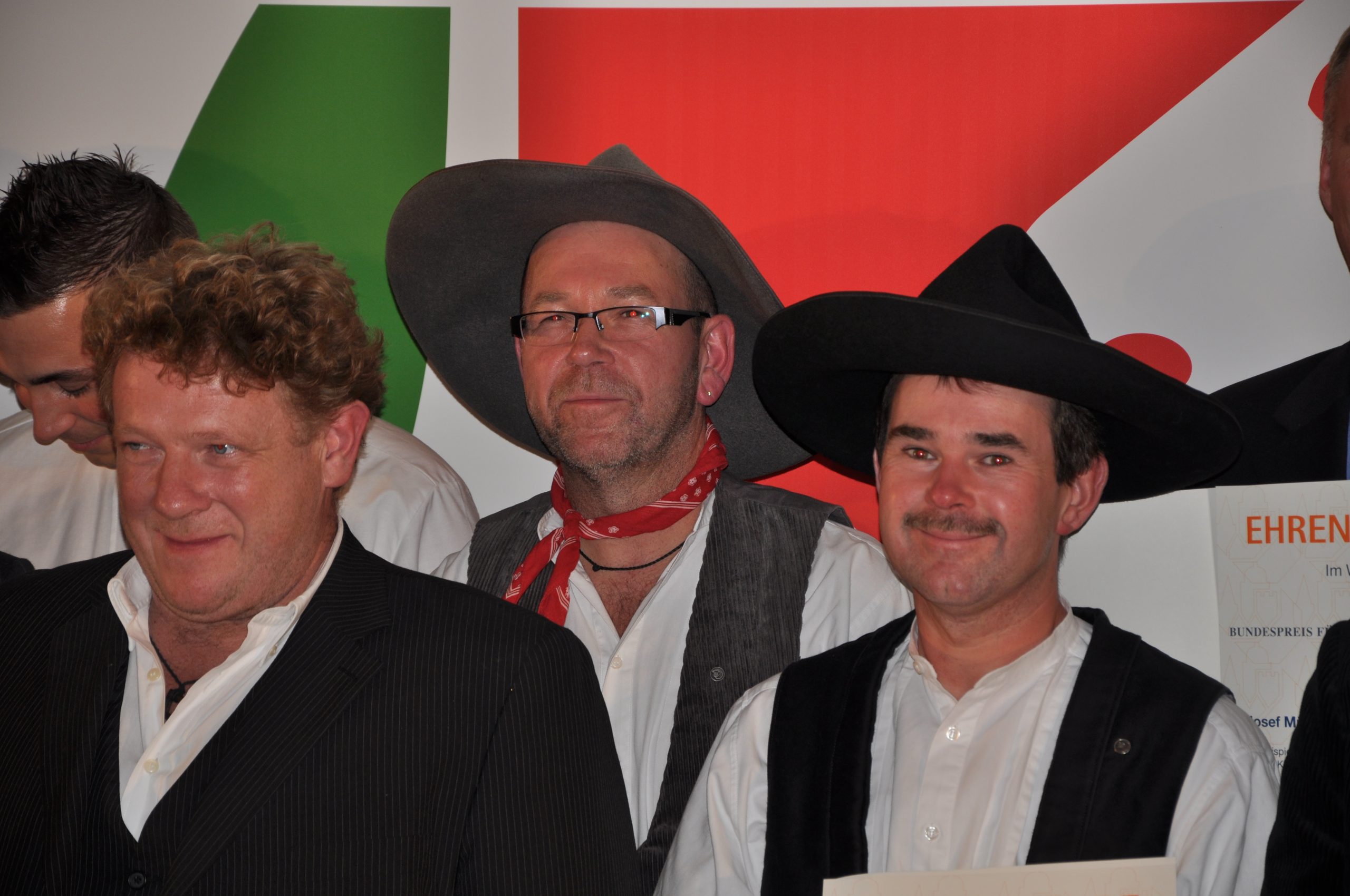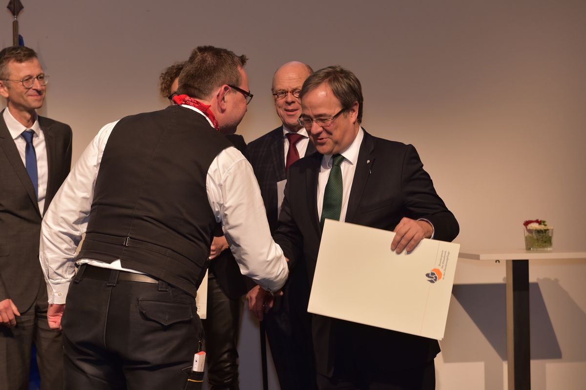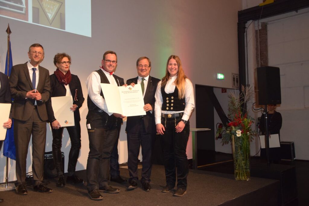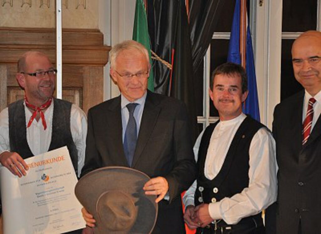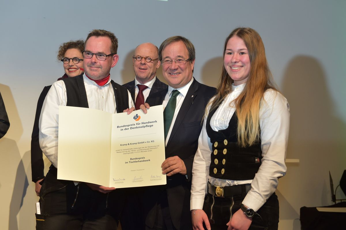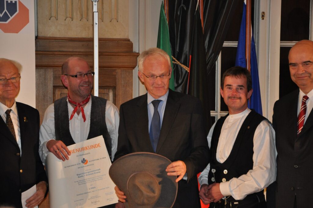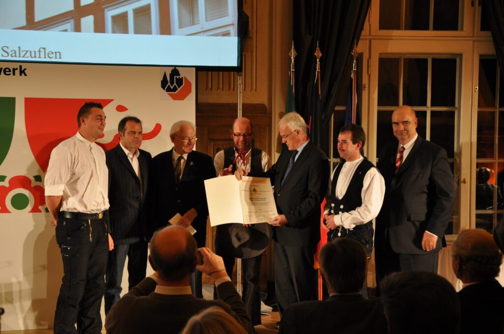 Eine besondere Ehrung. Den Bundespreis für Handwerk in der Denkmalpflege überreichten Ministerpräsident Jürgen Rüttgers und Handwerkspräsident Otto Kenzler (rechts) an Andreas und Guido Kramp (2. v.r.) für das erfolgreich sanierte alte Salzufler Küsterhaus.