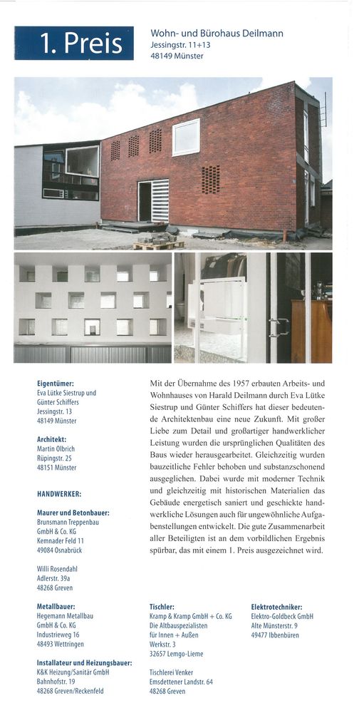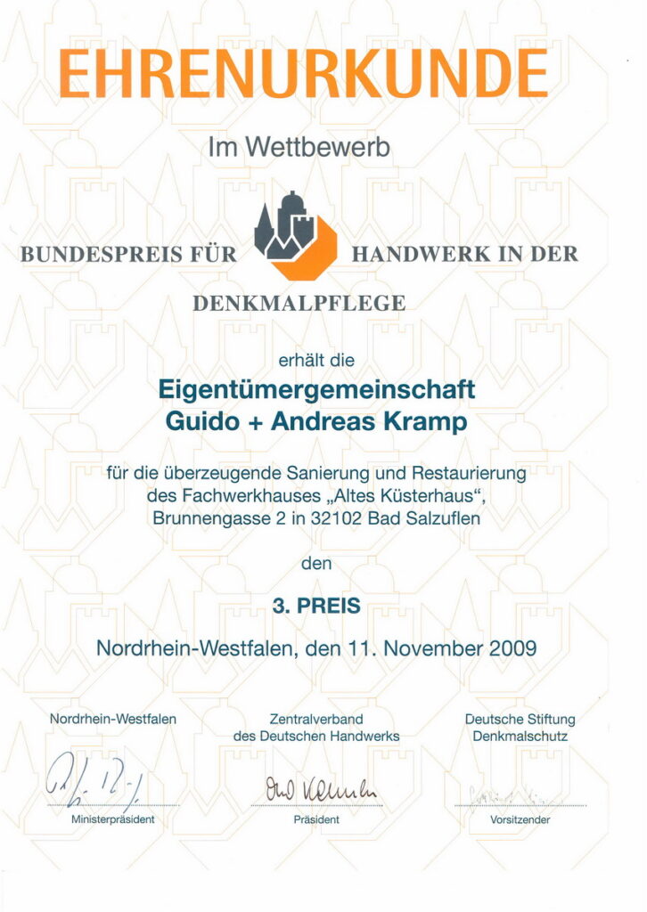 Die Eigentümergemeinschaft Kramp hat am Beispiel des schon fast aufgegebenen Fachwerkhauses Brunnengasse 2 in Bad Salzuflen eindrucksvoll den Beweis angetreten, dass eine qualitätvolle, denkmalpflegerische Restaurierung wirtschaftlich machbar ist. Dafür wird sie mit dem dritten Preis in Höhe von 2.500 Euro ausgezeichnet. Das in einer ebenso schwierigen wie wichtigen städtebaulichen Situation gelegene ehemalige Kantoren- und Küsterhaus konnte mit erfahrenen und im Team eingespielten Handwerksbetrieben wieder zu einem Blickfang im Baugefüge der Brunnengasse, unweit des Marktplatzes, entwickelt werden. Die Jury überzeugte der sorgsame Umgang mit der Wertigkeit der Substanz des Ensembles, der sich in den handwerklichen Details wiederfindet.