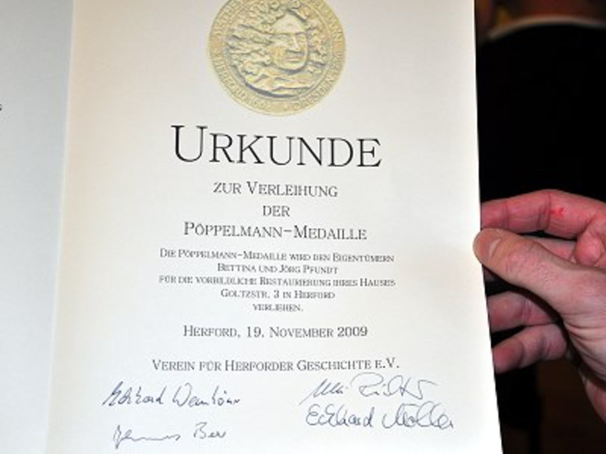 Die Pöppelmann-Medaille wird den Eigentümern Bettina und Jörg Pfundt für die vorbildliche Restaurierung ihres Hauses „Goltzstr. 3“ in Herford verliehen. Besonders hervorzuheben sind die schonende Sanierung der historischen Fensterfront und die denkmalgerechte Wiederherstellung der das Grundstück begrenzenden Zaunanlage. So ist ein gelungenes Beispiel für die engagierte und fachgerechte Erhaltung eines mehr als hundert Jahre alten bürgerlichen Hauses entstanden, das unser Stadtbild mitprägt.