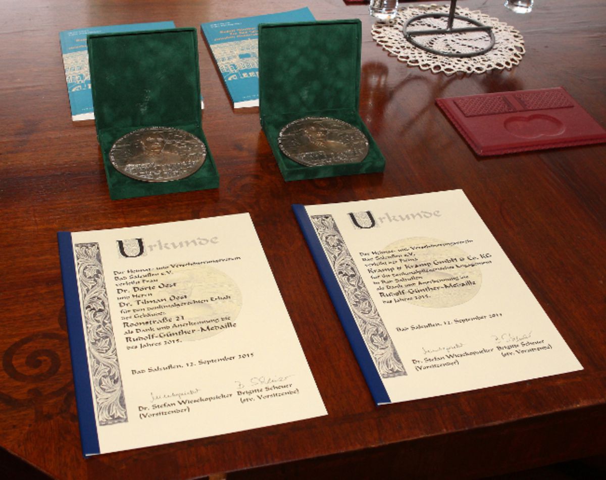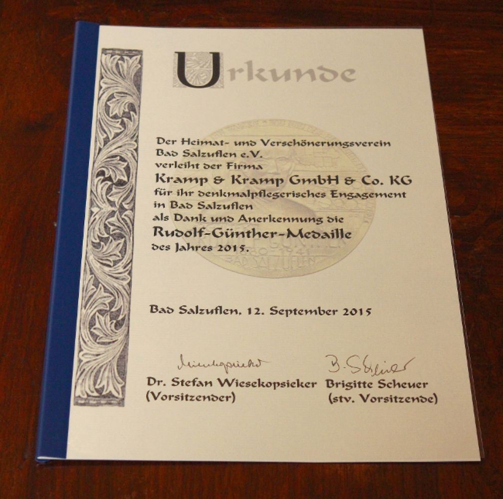 Die Medaille ist benannt nach dem Salzufler Architekten Rudolf Günther und wird für die vorbildhafte, besondere Restaurierung eines Denkmals oder erhaltenswerter Bausubstanz durch den dort ansässigen Verschönerungsverein verliehen. Wir freuen uns sehr über diese Auszeichnung.